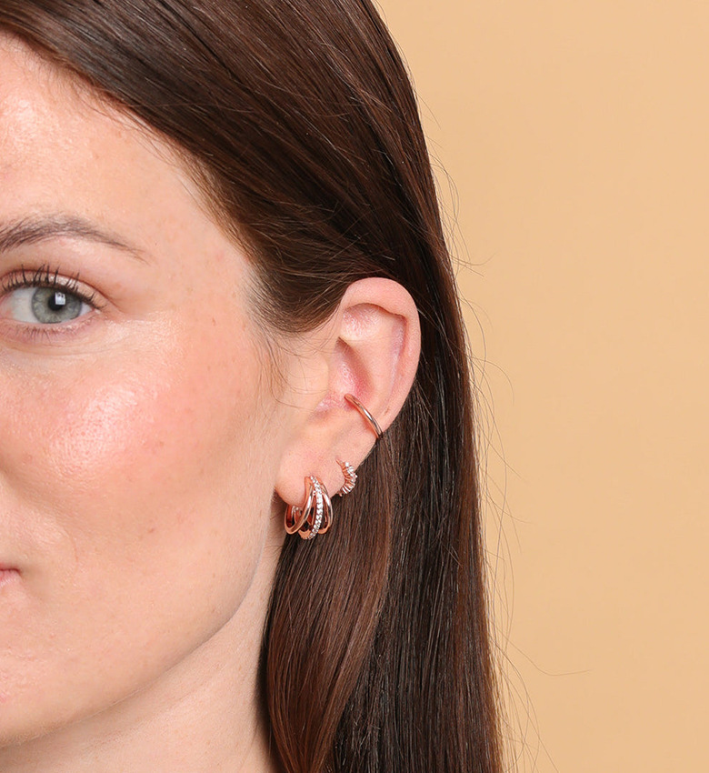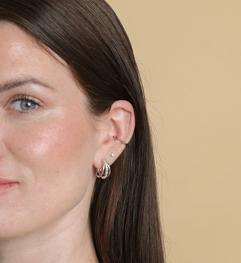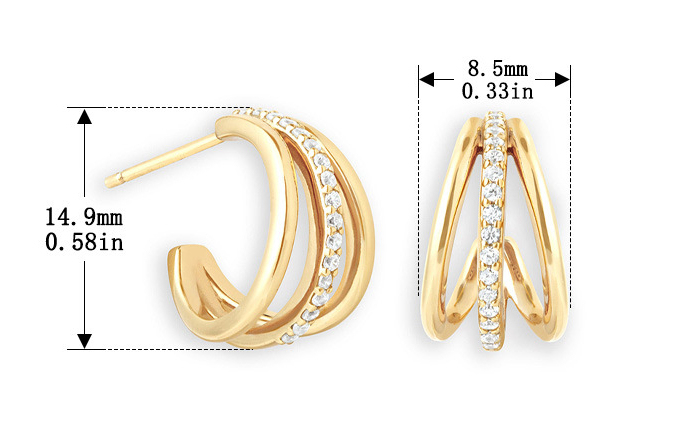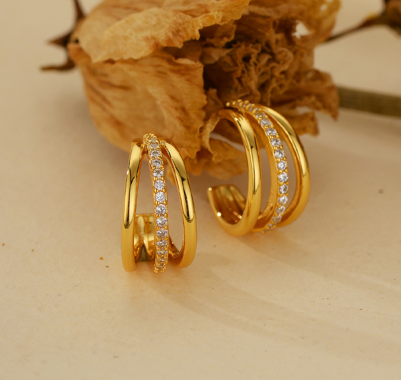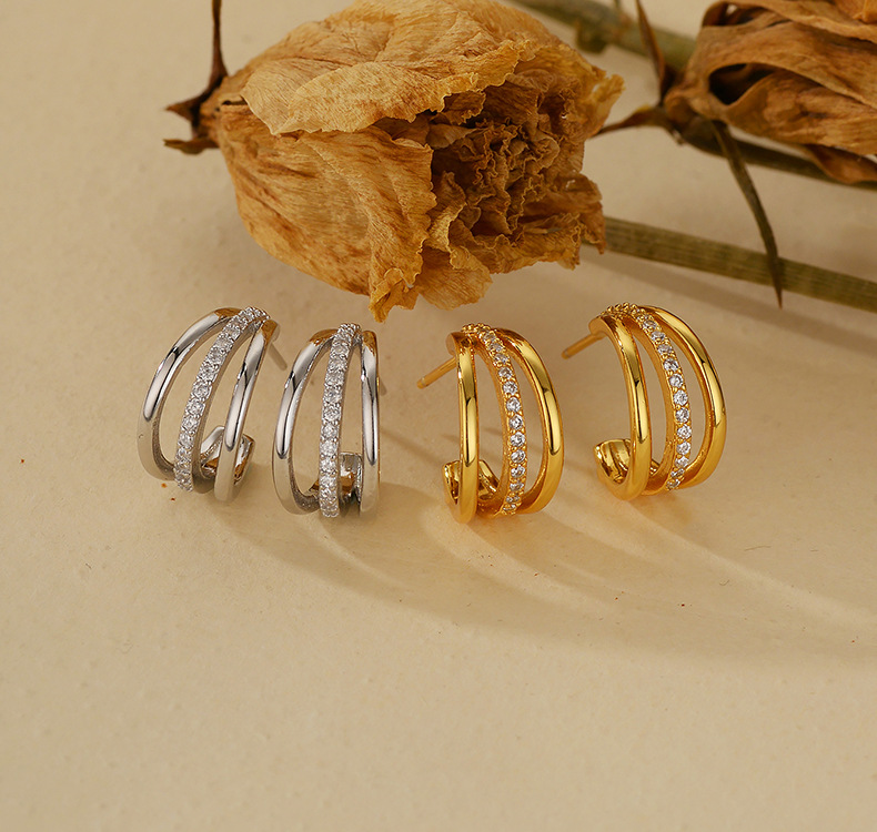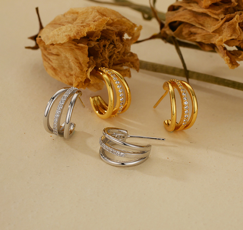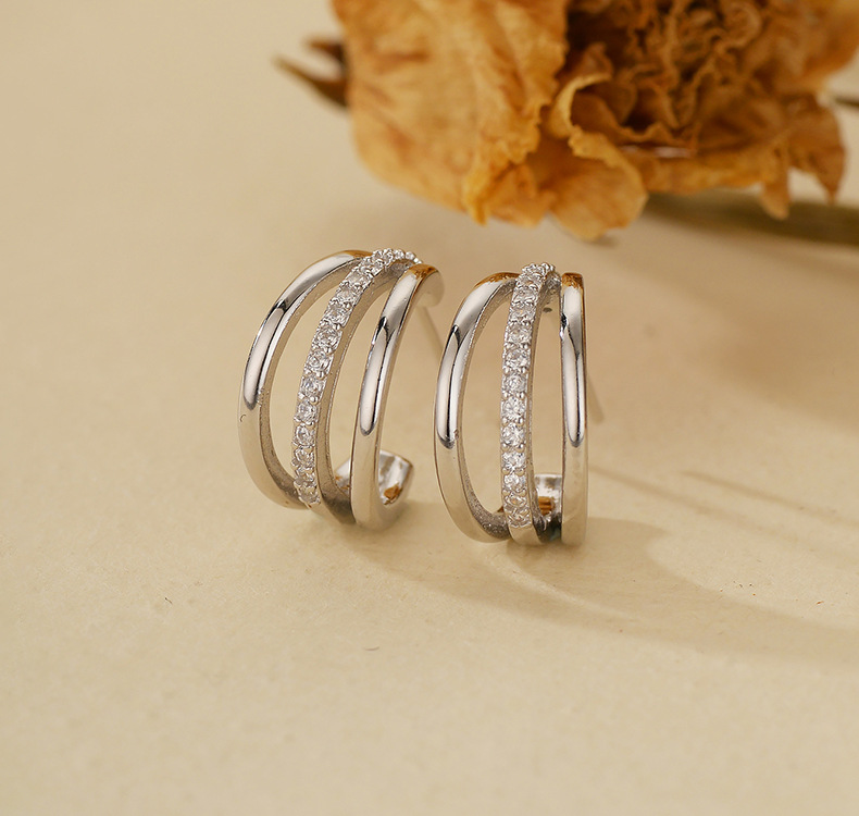 925 Silver C-shaped Three-layer Wave Single Row Diamond Geometric Earrings